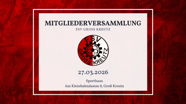 Zur diesjährigen Mitgliederversammlung des FSV Groß Kreutz e.V., lädt der Vorstand alle Mitglieder am 27.03.2026 um 19.00 Uhr auf den Sportplatz Am Kleinbahndamm 8 ein.